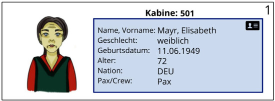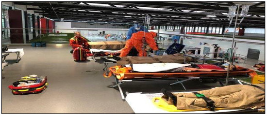 A ship’s superstructure, including a board hospital (Figure 2) and decks with associated cabins, was simulated in the cruise terminal. Sick passengers were represented by paper-based simulators as a consequence of the necessary contact reduction (Figure 3).
