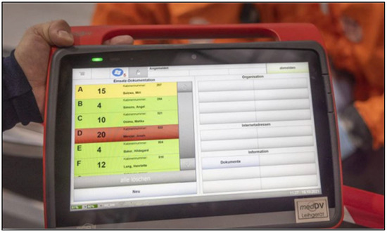 On the second day of the exercise, a tablet-based triage algorithm was tested, which was developed as part of the ARMIHN project specifically for mass casualty incidents involving infected/sick people (Figure 4). Due to the digital recording of patient data on-site, it was intended to provide a fast orientation for the emergency services in assessing the severity of the illness.