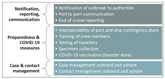 A meeting in February 2022 under the HEALTHY GATEWAYS’ framework analysed a COVID-19 outbreak onboard a cruise ship applying modified IAR methodology [7,8,9]. Rather than focusing on country-level response areas, prevention and response topics (Figure 1) were addressed in the cruise ship context; topics selected were those considered for revision in future versions of HEALTHY GATEWAYS guidelines.