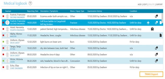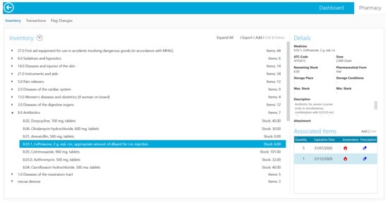 A linked connection to the pharmacy module automatically updates the pharmacy inventory when documenting the prescription of medication in the medical logbook. Besides containing medication inventories, the pharmacy module also warns the user if medication is about to expire (Figure 2). Other modules include the documentation of vaccinations and medical certificates. There is the possiblilty to export data either as a list of all examinations according to the paper versions of the classic medical logbook for port authorities or as one complete case, e.g., in case a patient visits a doctor in a port. The system also supports a semi-automatic creation of Telemedical Maritime Assistance Service (TMAS) protocols and forms for insurances.
