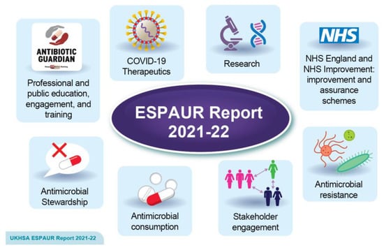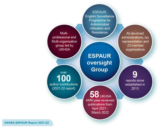 - UK Health Security Agency. English surveillance programme for antimicrobial utilisation and resistance (ESPAUR) Report 2021 to 2022. Available online: https://www.gov.uk/government/publications/english-surveillance-programme-antimicrobial-utilisation-and-resistance-espaur-report (accessed on 25 November 2022).