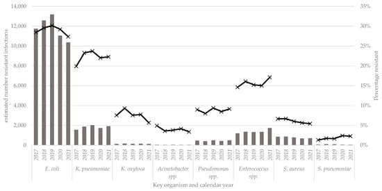 - Guy, R.; Higgins, H.; Rudman, J.; Fountain, H.; Henderson, K.L.; Bennet, K.; Hopkins, K.L.; Gerver, S.M.; Mirfenderesky, M. Chapter 2 Antimicrobial resistance (AMR). In English Surveillance Programme for Antimicrobial Utilisation and Resistance (ESPAUR) Report 2021 to 22; UK Health Security Agency: London, UK, 2022. [Google Scholar]