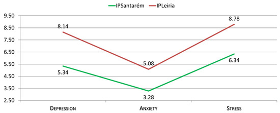 Comparing the level of the Polytechnic Institute (IP) attended, there were significant differences between the averages of depression, anxiety, and stress (Student’s t-test) with higher scores in the three dimensions in IPLeiria students; that is, the affective states of these students were more negative (Figure 1).
