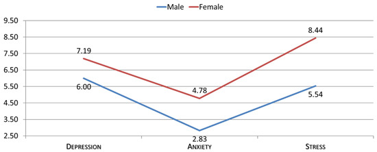 Regarding gender (Figure 2), females had statistically higher scores when compared to males, meaning that the females’ affective states were more negative.