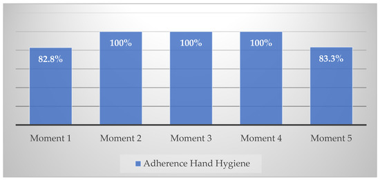 As can be seen in Figure 1 below, the analysis of the results demonstrates that moment 1 (before touching a patient) registered the lowest adherence (82.8%), followed by moment 5 (after touching the patient surroundings), which registered 83.3%; the other moments registered 100% adherence. Other studies reported lower adherence to the practice of hand hygiene at moment 1 [4,10].
