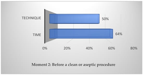 Although the results outperform other studies, for example, a longitudinal study conducted in intensive care units over 3 years [8], the recommendations suggested by the WHO on the practice of hand hygiene fall short [2]; particularly noteworthy were non-compliance with time (64%) and hygiene technique before performing aseptic procedures (50%), as shown in Figure 2. In this situation, the likelihood of transmitting infectious agents is dangerously increased, hence it puts the children’s safety at risk.