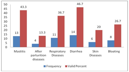 Almost six types of common disease episodes had driven smallholder dairy keepers to extensively use antimicrobials, namely diarrhea (46.7%) followed by mastitis (43.3%) and respiratory diseases (36.7%). Figure 1 summarizes their valid percentages with their frequencies of occurrence as mentioned by individual dairy keepers.