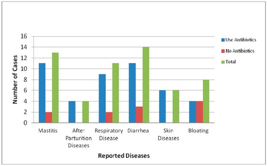 However, as far as Figure 2 is concerned, the data indicated that although the total number of diarrhea cases was higher (n = 14) than those of mastitis (n = 13), the use of antimicrobials was much higher in the treatment of mastitis (84.6%; n = 11/13) as compared to the treatment of diarrhea (78.6%; n = 11/14). This was probably due to the fact that farmers would pay more attention to lactating animals since they are their sole source of milk and cash in the family.