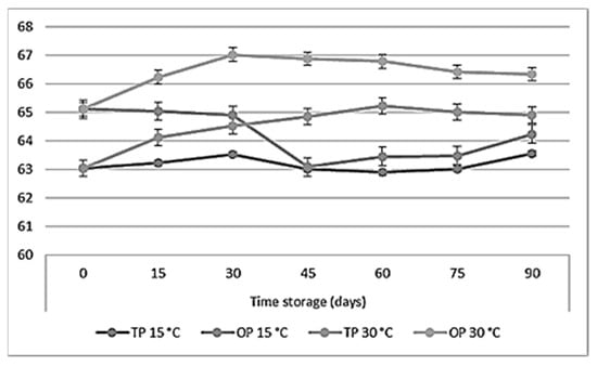 As can be seen in Figure 1, the addition of orange peel to jam affected the content of TSS. In particular, TSS values examined ranged from 63.03 to 63.55 °Brix for TP jam at 15 °C and 63.03–64.89 °Brix at 30 °C. While TSS values fluctuated from 65.11 to 65.23 °Brix for OP jam at 15 °C and 65.11 to 66.33 °Brix at 30 °C.