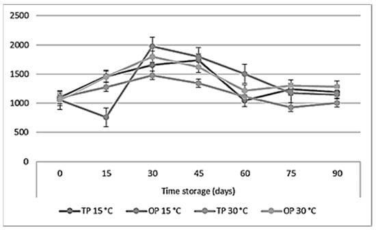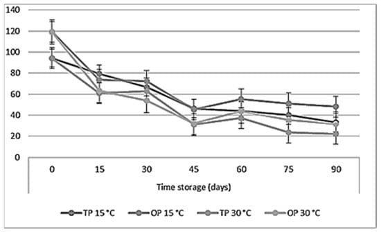 In DPPH assay (Figure 2), the jam prepared with traditional pectin (TP) showed values ranging from 94.21 to 33.02 (% I) at 15 °C and 94.21 to 22.45 at 30 °C. In particular, it was observed that during storage of jams to reduce antioxidant capacity. The same trend was observed for jams prepared with addition orange peel (OP), being values ranging from 119.06 to 48.03 (% I) at 15 °C and 119.06 to 31.56 at 30 °C.