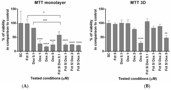 In monolayer, MTT assay showed that Dox (≥1 µM) induced cytotoxic effects in all tested conditions (alone and in combination), reducing cell viability. Fct alone did not affect cell viability. The combination of Fct 5 µM with Dox 0.1 µM statistically differed from the exposure of each compound alone. In 3D culture, cell viability only differed from the control when cells were exposed to Dox 5 µM (Figure 1).
