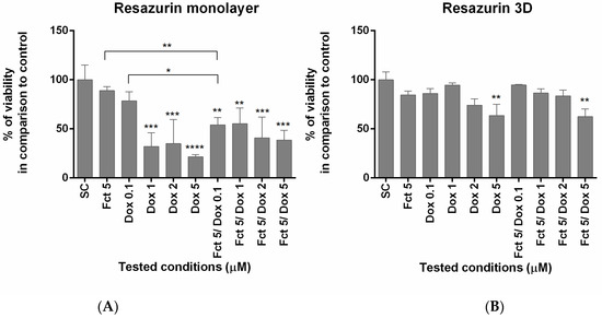 The results of the resazurin assay were similar to those of the MTT assay. In monolayer, cell viability differed from the SC group in all conditions, except from Fct and Dox 0.1 µM alone. The combination of Fct 5 µM with Dox 0.1 µM also differed statistically from the exposure of either compound alone. The same conditions tested in 3D only revealed effects on cell viability in cells exposed to Dox 5 µM (Figure 2).