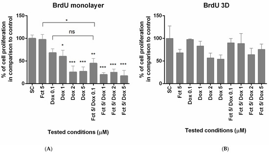 The effects on cell proliferation were studied by BrdU assay. In monolayer, proliferation was reduced in Dox concentration of 1–5 µM and in all Fct plus Dox combinations. Fct and Dox 0.1 µM alone did not have any effect on cell proliferation, but in combination reduced significatively the percentage of cell proliferation in relation to the control. In 3D culture, none of the tested conditions revealed effects on cell proliferation (Figure 3).