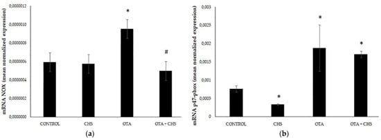 The aim of our work was to evaluate the potential protective action of two mycotoxin binders, MIX and CHS, in reducing renal oxidative stress in broiler chickens fed an OTA-containing diet. For this purpose, since NADPH oxidase 4 (NOX), the most abundant isoform of the NADPH oxidase family in the kidney, plays an essential role in the production of ROS by reducing molecular oxygen to superoxide [], we analyzed the transcript levels of NOX and its subunity, p47-phox.