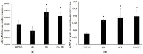 In contrast, MIX did not show a protective effect on NOX and p47-phox levels when used in co-treatment with OTA (Figure 2a,b).