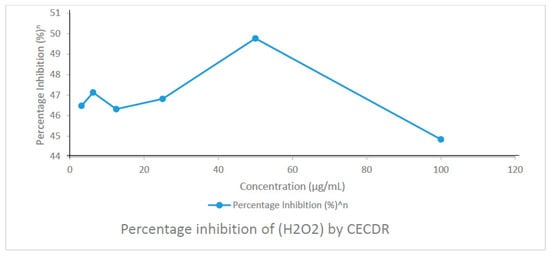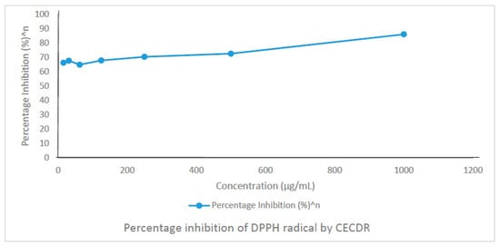 Figure 1 shows the quantitative DPPH analysis and revealed DPPH radical scavenging activity of CECDR. The percentage inhibition was concentration dependent with an effective concentration (EC50) of −646.67 µg/mL compared to the ascorbic acid standard with EC50 of −10.58 µg/mL. The percentage inhibition against concentration showed a statistically positive correlation (p < 0.05) (R2) correlation of 0.9548. n = 3.