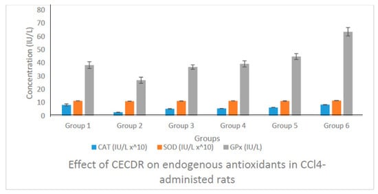 GPx activity in the untreated group showed significant (p < 0.05) decrease compared to the normal control, while treatment with CECDR markedly increased GPx concentration in all the test groups. Treatment with the standard drug, silymarin in Group 6 also showed significant (p < 0.05) increase in the activity of GPx compared to the untreated group.