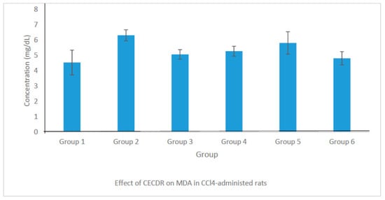 A significant (p < 0.05) reduction in the concentration of endogenous antioxidant enzymes (catalase, superoxide dismutase, and glutathione peroxidase) was observed in Group 2 due to CCl4 administration without treatment (Figure 3), suggesting that the free radicals generated by CCl4 overwhelmed the endogenous antioxidant enzymes activities. However, treatment with CECDR resulted in significant elevation (p < 0.05) elevation across the test groups. This could be attributed to the fact that CECDR is rich in antioxidants which revived and enhanced the activities of the endogenous antioxidant enzymes. Flavonoids, terpenoids, and phenolics found in CECDR are important antioxidants that can aid in combating lipid peroxidation and oxidative stress induced by CCl4. Additionally, administration of CCl4 significantly (p < 0.05) elevated the concentration of malondialdehyde (Figure 4) in Group 2 (CCl4—induced and untreated) rats compared to those in Group 1 (Normal control). This could be due to lipid peroxidation by the free radical generated by CCl4. The test groups showed a significant (p < 0.05) reduction in their malondialdehyde concentration, suggesting that C. dependens abated lipid peroxidation.