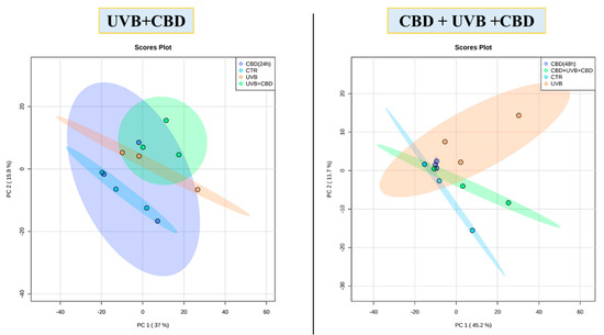 Principal component analysis (PCA) of membrane fractions obtained from keratinocytes from control group (CTR), cell group treated with 4 μM CBD for 48 h (CBD 48 h), cell group treated with CBD for 24 h (CBD 24 h), cell group exposed to UVB (312 nm) at 60 mJ/cm2 (UVB), cell group cultured for 24 h before and after UVB irradiation in medium containing 4 μM CBD (CBD + UVB + CBD) and cell group cultured for 24 h after UVB irradiation in medium containing 4 μM CBD (UVB + CBD).