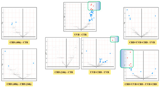 Volcano plots comparing the effects of cannabidiol treatments (4 μM CBD for 48/24 h; 4 μM CBD for 24 h before and 24 h after UVB irradiation; 4 μM CBD for 24 h after UVB irradiation) on keratinocyte membranes from control and UVB (312 nm, at 60 mJ/cm2)-irradiated groups. (Significant features (in blue) had p < 0.05; significant features (in red) had FDR-adjusted p-value < 0.05.)