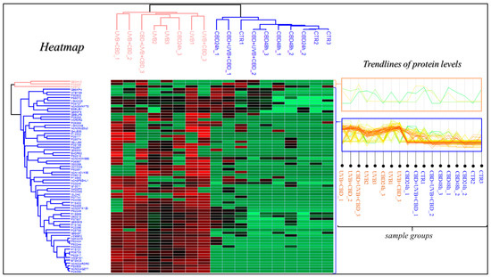 Heat map and clustering for significant proteins from control group (CTR), cell group treated with 4 μM CBD for 48 h (CBD 48 h), cell group treated with CBD for 24 h (CBD 24 h), cell group exposed to UVB (312 nm) at 60 mJ/cm2 (UVB), cell group cultured for 24 h before and after UVB irradiation in medium containing 4 μM CBD (CBD + UVB + CBD) and cell group cultured for 24 h after UVB irradiation in medium containing 4 μM CBD (UVB + CBD).