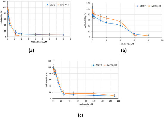 Antiproliferative activity of AKT inhibitors against parental (MCF7) and hydroxytamoxifen-resistant (MCF7/HT) breast cancer cells (72 h treatments with compounds): (a) AKT inhibitor IV; (b) 10-DEBC; (c) luminespib).