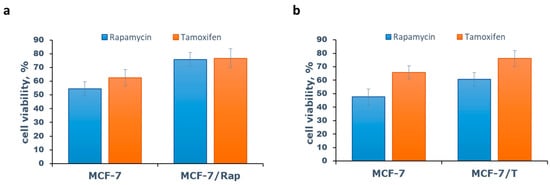Cross-resistance of MCF-7/Rap (a) and MCF-7/T (b) cells to rapamycin and tamoxifen. The cells were treated with 2 μM rapamycin or 3 μM tamoxifen for 3 days with subsequent analysis of the number of viable cells using the MTT test. Data represent mean value ± S.D. of three independent experiments. A total of 100% was set as the viability of cells treated with the vehicle control.