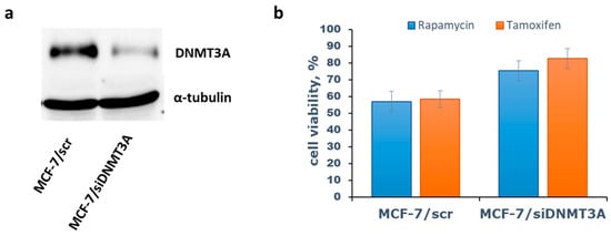 (a) Western blotting of the protein samples of the MCF-7, MCF-7/Rap, and MCF-7/T cells. The blot represents the results of one of the three similar experiments. Expression of α-tubulin, ERα, Akt/p-Akt, S6K/p-S6K, mTOR/p-mTOR, DNMT3A, DNMT1 was studied. (b) Reporter analysis of the ERα transcriptional activity. The relative luciferase activity was calculated in arbitrary units as the ratio of the luciferase to the galactosidase activity. Data represent the mean value ± S.D. of three independent experiments. (c) The average methylation level of the six CpG dinucleotides in the LINE-1 region. *** p-value < 0.0006. To further investigate the role of DNMT3A in the formation of cell-resistant phenotypes, the knockdown of the DNMT3A via siRNA was performed. As revealed, transfection of siRNA DNMT3A results in the progression of partial resistance of MCF-7 cells to both tamoxifen and rapamycin (Figure 3).