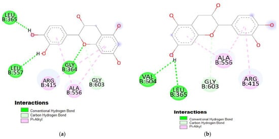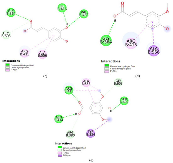 Two-dimensional representation of the docked ligand’s and the target’s binding site. (a) catechin; (b) epicatechin; (c) caffeic acid; (d) ferulic acid; (e) syringic acid.