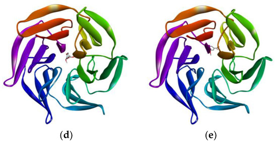 Three-dimensional representation of binding site of selected polyphenolic compounds of Ocimum tenuiflorum with Keap1. (a) catechin; (b) epicatechin; (c) caffeic acid; (d) ferulic acid; (e) syringic acid.