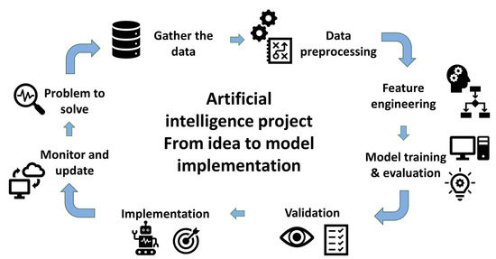 It is important to understand the three main types of machine learning (ML) before starting to build models: supervised learning, unsupervised learning, and reinforcement learning. In supervised learning, a model is generated using labeled data with a known outcome of interest for the training set. The model adjusts the weights until it is fitted for classification or regression. Classification analysis focuses on assigning a class to each object, such as determining if a patient has a disease. The output of a classification model is typically nominal. On the other hand, regression models typically have continuous output that can be used, for example, to estimate the likelihood of a disease. Cross-validation must be performed after the learning process to ensure that the model is not underfitting or overfitting. An underfitting model will not accurately predict or classify unseen data and training data, while an overfitting model is ideal for training data but cannot perform accurately on unknown data [10]. The workflow for implementing artificial intelligence is shown in Figure 1.
