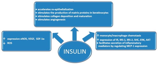 Insulin (INS) is a peptide hormone that has many physiological functions and, in particular, is involved in the regulation of blood glucose levels. The presence of insulin receptors in the keratinocytes and fibroblasts of the epidermis was previously confirmed [1]. It was previously found to affect wound healing by reducing inflammation, regulating oxidative reactions, and increasing collagen deposition [2]. Topical application of insulin to skin wounds stimulates the migration and proliferation of fibroblasts and endothelial cells, as well as the production of extracellular matrix proteins. Furthermore, insulin stimulates the migration of keratinocytes in a dose-dependent manner by activating a transcription nuclear factor-kappa B (NF-κB) [3,4,5,6]. The hormone was previously found to promote the closure of wound edges by activating the ERK1/2 and PI3K signaling [7]. The effect of insulin on accelerated wound healing involves increased expression of the integrin receptors laminin (α3β1) in keratinocytes, as well as an increase in the levels of LN332 (Laminin 332) [6]. INS prevents cell apoptosis induced by inflammatory processes and promotes angiogenesis (development of new blood vessels) by stimulating the expression of VEGF through AKT signaling [8]. It regulates inflammatory responses in the wound by inducing advanced infiltration and resolution of macrophages [9]. In pre-clinical studies, topical administration of insulin as a solution or ointment was found to have no effect on blood glucose levels [10]. Figure 1 shows the therapeutic potential of insulin in the treatment of chronic and acute skin wounds [11,12,13,14,15,16,17].