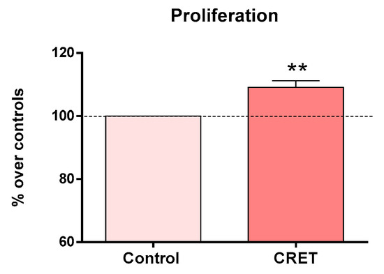 Cell proliferation after 48 h of intermittent CRET exposure at 100 µA/mm2. Data are means ± SEM normalized over the corresponding sham-exposed controls (dash line 100%). Six experimental replicates. **: 0.001 ≤ p < 0.01. Student’s t-test.