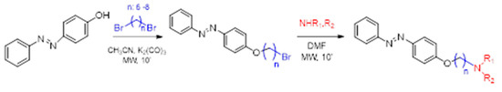 To obtain a series of resveratrol derivatives, azobenzene was first reacted with the corresponding dibromo alkane (6–8 carbon atoms) and then the intermediate was reacted with the secondary amine. Five compounds (M1–M5) were synthesized in moderate yields. These compounds were purified using column chromatography and identified using 1H and 13C NMR. The derivatives were evaluated as iAChE by performing Ellman’s method [8] (Figure 1).