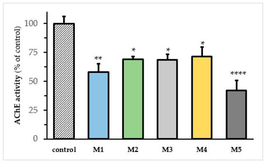 We used SH-SY5Y cells to evaluate the effects of M1–M5 analogs on the AChE activity. For this purpose, the SH-SY5Y cells were treated for 24 h with the aforementioned compounds, and the AChE activity was determined using Elman’s method [8]. All the tested compounds significantly inhibited the AChE activity in the cell assay (Figure 2). The drug concentration used in this assay corresponded to the IC50 previously determined in vitro [6,7].