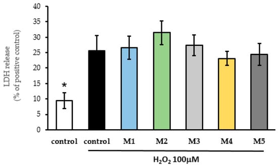 Evaluation of antioxidant properties of resveratrol derivatives against exposure of SH-SY5Y cells to 100 μM H2O2. SH-SY5Y cells were pretreated M1 (1.1 μM), M2 (1.4 μM), M3 (0.9 μM), M4 (0.96 μM), and M5 (0.27 μM) for 24 h before the oxidative insult. Afterward, 100 μM H2O2 was added to the cell culture and incubated for 24h, in the presence of resveratrol derivatives. Cellular damage was analyzed using an LDH release assay. Data are expressed as a percentage of LDH released compared with the positive control. Data are expressed as the means ± SEM of at least four independent experiments. (*) denote p < 0.05 concerning control H2O2.