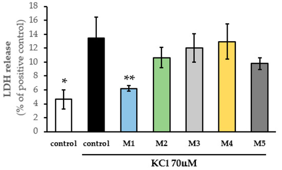 We investigated the potential protective activity of M1–M5 against Ca2+ overload in the SH-SY5Y cells as in Cavallaro et al. [8]. For this purpose, the SH-SY5Y cells, previously treated with the aforementioned compounds, were subsequently exposed for 24 h to depolarizing medium containing 70 mM KCl, which induced Ca2+ overload and cell death. The M1–M5 were administered 24 h before the incubation of the cells with high K+ and maintained throughout the experiment. Subsequently, the LDH release was measured as a marker of the cell damage. As shown in Figure 4, only compound M1 was shown to exhibit cytoprotective effects against 70 mM KCl treatment.