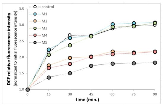 The influence of M1–M5 was analyzed on the intracellular production of ROS in SH-SY5Y cells. This study was performed using fluorogenic 2′,7′-Dichlorodihydrofluorescein diacetate (H2DCFDA) dye. After the passive diffusion of the H2DCFDA into the SH-SY5Y cells, it was deacetylated by intracellular esterases into a non-fluorescent compound. In the presence of cellular ROS, it was oxidized into highly fluorescent 2′,7′-dichlorofluorescein (DCF) [9]. The compounds M2, M4, and M5 can reduce ROS production in SH-SY5Y cells. (Figure 5).