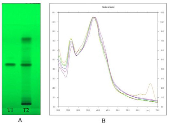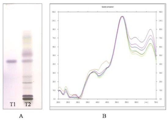 (A) Image of HPTLC separation of leaf methanolic extract of A. nervosa after derivatization with anisaldehyde-sulphuric acid reagent. Track T1 represents Ursolic acid standard and track T2 represents leaf methanolic extract of A. nervosa with matching band of Ursolic acid with Rf value 0.57. (B) Matching the identity of Ursolic acid in standard (Shown in different colours for different standard concentration) and sample track (Orange coloured) by comparing UV-VIS overlay spectra at 540 nm.