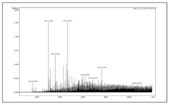 The ElectroSpray Ionization-Mass Spectrometry (ESI-MS) analysis indicated the presence of two abundant peaks of molar mass 301.1400 and 467.1931, which are assigned to Quercetin and Ursolic acid, respectively (Figure 4).