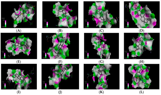 3D visualization of 6LU7 binding with beta-amyrin (A), betulin (B), germanicol (C), taraxerol (D), lupeol (E), lupine (F), simiarenol (G), tirucallol (H), ursolic acid (I), oleanolic acid (J), alpha-amyrin (K), and nelfinavir (L) using Biovia Discover Studio. The green and pink colors represent H-bond acceptor and donor regions, respectively.