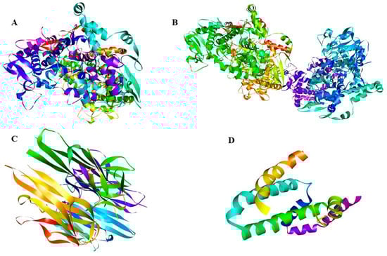 3D crystal structure of inflammatory proteins (A) cyclooxygenase-1, (B) cyclooxygenase-2, (C) tumor necrosis factor (TNF) alpha, and (D) interleukin-10 (IL-10).
