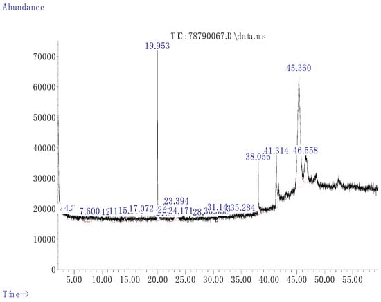 The gas chromatography and mass spectroscopy analysis of the aqueous extract of Myrica esculenta was performed by the Nepal Academy of Science and Technology (NAST), Kathmandu, Nepal. For this study, an Agilent 7890A GC-Agilent 5975C inert MSD triple axis detector was fitted with an Agilent 19091s-433 (30 m × 250 µM × 0.25 µM) fused column. After that, carrier helium gas was used with an adjusted column velocity of 1 mL/min. The ion source and interface temperature were maintained at 230 and 320 degrees Celsius with applied 6.6018 psi pressure. The 2 µL injector in split mode with a ratio of 75:1 with injection temperature was 230 degrees Celsius. After that, the column temperature was initially maintained at 32 degrees Celsius for 5 min and changed to 70 eV at a rate of 5 degrees Celsius/minute, respectively. The temperature was increased at 280–320 °C for 5 min. The total elution time was 59.6 min. The relative percentage amount of the compound was evaluated by comparing its average peak area to the total area [24].