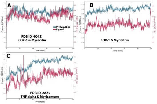 PDB ID-4O1Z COX-1 (A), COX-1 (B), and PDB ID 2AZ5 TNF alpha (C) with ligands myricetin, myricitrin, and myricanone. RMSD values plotted against simulation 100 ns.