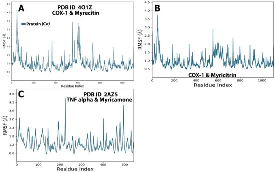 All Cα atoms were subjected to the RMSF analysis for structural flexibility for each time point throughout the simulation for PDB ID-4O1Z COX-1-myricetin, PDB ID-4O1Z COX-1-myricetrin, and PDB ID 2AZ5 TNF alpha—myricanone. (Figure 5A–C). To elucidate the local conformational shift of the complex, RMSF analysis of the PDB ID-4O1Z COX-1 and PDB ID-2AZ5 TNF alpha structure RMSF has been conducted. During PDB ID-4O1Z COX-1-myricetin and myricitrin simulation, the peaks in the graph RMSF illustrate the fluctuation of Cα. A and B, more profound analyses of the secondary structure of protein RMSF display the enhanced flexibility in the loop region followed by the beta-strand, and the alpha helix was more stable. The myricetin and myricitrin interact with PDB ID-4O1Z COX-1, mainly in the region of alpha-helices amino acids, so it displays good stability similar to alpha helices (green lines). The RMSF values of amino acids interacting with myricetin and myricitrin are 0.428–3.749 and 0.486–3.751 Å, respectively. These interacting residues allow the myricetin and myricitrin to explore the PDB ID-4O1Z COX-1 binding site to find a favorably energetic location to interact with the surrounding residue.