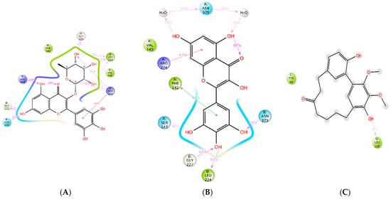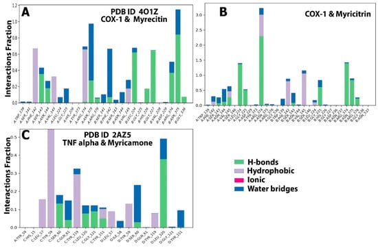 Furthermore, in Figure 6B, myricitrin formed hydrogen bonds at positions A:Ser143, A:Asn144, A:Val145, A:Leu224, A:Gly225, A:Arg374, A:Asn375, B:Ser143, B:Gly225, B:Arg374, B:Asn375, and B:Arg376 in COX-1 protein. The ligand was found to interact with the protein for approximately 2.3 interaction fraction of time. Figure 6C shows that myricanone formed hydrogen bonds at amino acid positions C:Ser60, C:Gln61, C:Leu120, C:Gly121, C:Tyr151, D:Ser60, and D:Leu120. The hydrogen bond formed by Leu120 in the D chain of TNF-α protein stabilized for about 0.4 of the interaction fraction time. All three ligands also formed hydrophobic and ionic interactions with different amino acids, as depicted in Figure 6.