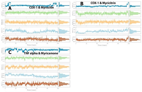 The radius of gyration (rGyr) provides a detailed indication of the compactness of the selected target protein structures with ligands. The myricetin-COX-1, myricitrin-COX-1, and myricanone- TNF alpha complexes ranged between 3.783–3.891 Å, 4.102–4.345 Å, and 3.358–3.662 Å, respectively. However, the number of intra-hydrogen bonds ranges between 0–2 for myricitrin-COX-1, myricetin-COX-1, and 0–1 for myricanone- TNF. The solvent-accessible surface area (SASA) helps determine how well the ligand and solvent interact during the complete simulation runtime. In the current study, the values of SASA range between 9.258–48.928 Å for the myricetin-COX-1 complex, and11.428–123.515 Å for the myricitrin-COX-1 complex; however, values range between 64.599–233.373 Å for the myricanone-TNF alpha complex. The solvent-accessible surface area of ligands with contributions from solely oxygen and nitrogen atoms was also measured using a polar surface. Furthermore, the molecular surface area (MolSA) was also calculated with a 1.4 Å probe radius that was equivalent to van der Waals surface area ranging between 355.514–372.228 Å for myricitrin-COX-1, and 312.612–332.148 Å and 310.953–327.422 Å for myricanone-TNF alpha (Figure 8A–C), respectively.