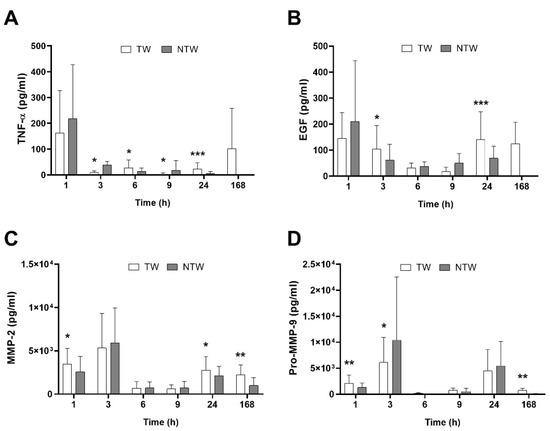 ELISA test results in samples from TW and NTW in a mice model: TNF-α (A), EGF (B), MMP-2 (C), and pro-MMP-9 (D) trends. Data are expressed as mean ± SD. Significant p-values: * p < 0.1; ** p < 0.05; *** p < 0.01 vs. NTW at the same time point.