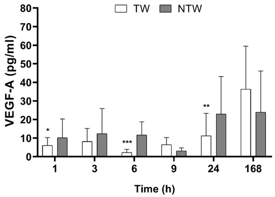 ELISA test results in samples from TW and NTW in a mice model: VEGF-A levels over time. Significant p-values for VEGF-A data were: p < 0.1 at 6 h and 9 h, p < 0.05 at 24 h. Data are expressed as mean ± SD. Significant p-values: * p < 0.1; ** p < 0.05; *** p < 0.01 vs. NTW at the same time point.