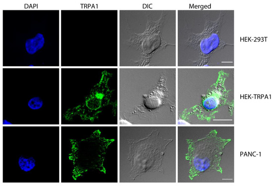 Expression of TRPA1 Protein in PDAC Cells: A. Immunofluorescence of fixed Panc-1 and HEK-293 T cells either transfected or un-transfected with pcDNA3.1 Plasmid encoding human TRPA1. Cells were stained with mouse monoclonal TRPA1 primary antibody (green), whereas DAPI nuclear staining is shown in blue. Scales are included in each image. Bars represent 10 µm. Notes: Reproduced with permission from Ref. [15]. Copyright 2021 Nature Portfolio.